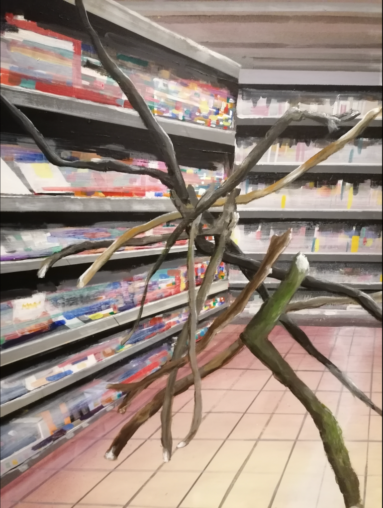 sinndefizite der arbeit mittels hyperkonsum zu kompensieren ist dann auch nicht die beste idee gewesen (2020), 80×100, Acryl auf Mdf
