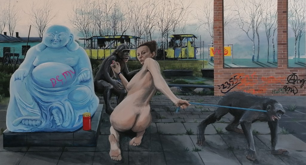 das zähmen widerspenstiger affen hinter geschliffenem kalk (2023), 220×110, Acryl auf Mdf